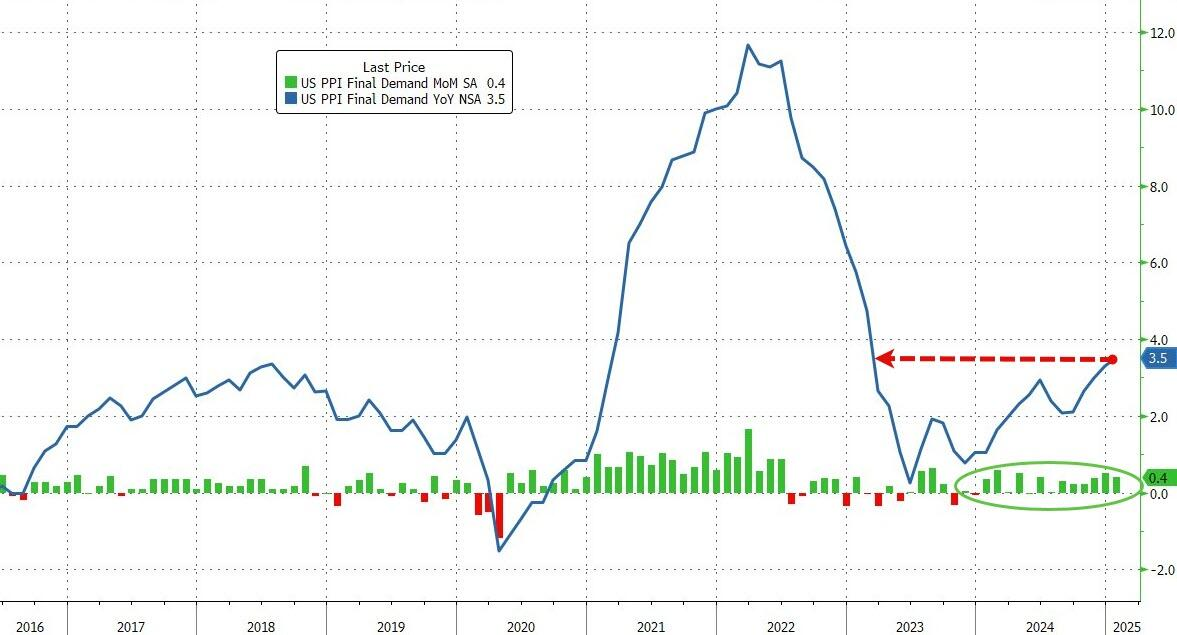 具体来看,好意思国1月PPI年率录得3.5%,为2023年2月以来最大增幅,市集预期为3.2%。好意思国1月PPI月率录得0.4%,市集预期为0.3%。